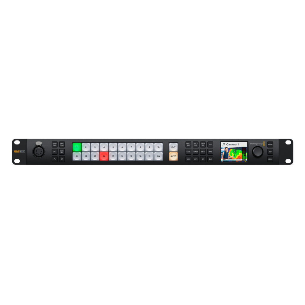Switcher con 2 bancos de mezcla, 20 entradas SDI 12G, 12 salidas SDI 12G, 2 procesadores DVE, 8 compositores, 2 salidas de visualización y SuperSource, con 6 canales para efectos visuales.