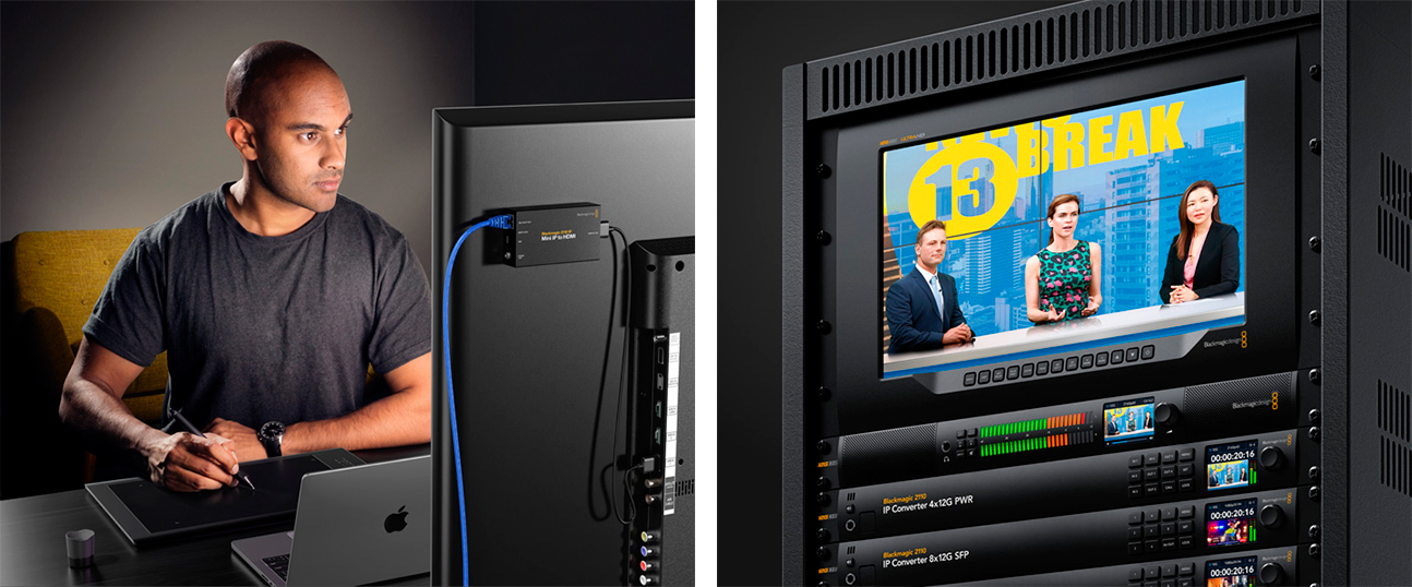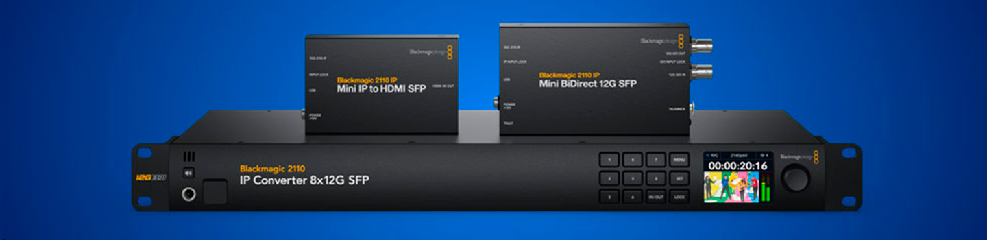 Estos conversores han sido desarrollados para integrar cualquier equipo SDI en sistemas de difusión IP 2110. Su diseño modular permite instalarlos en bastidores, junto a los dispositivos cuyas señales es preciso convertir. No obstante, con unidades Blackmagic Studio Camera, Blackmagic Audio Monitor 12G G3 y SmartView 4K G3, es posible diseñar gran parte de un sistema SMPTE-2110 sin conversores. Además, la mayoría de estos productos pueden alimentarse de forma remota. Sin embargo, los conversores brindan compatibilidad con el estándar SMPTE-2110 para todo tipo de equipos audiovisuales —tales como mezcladores, grabadores, procesadores para transmisiones, cámaras y televisores— de un modo económico.
