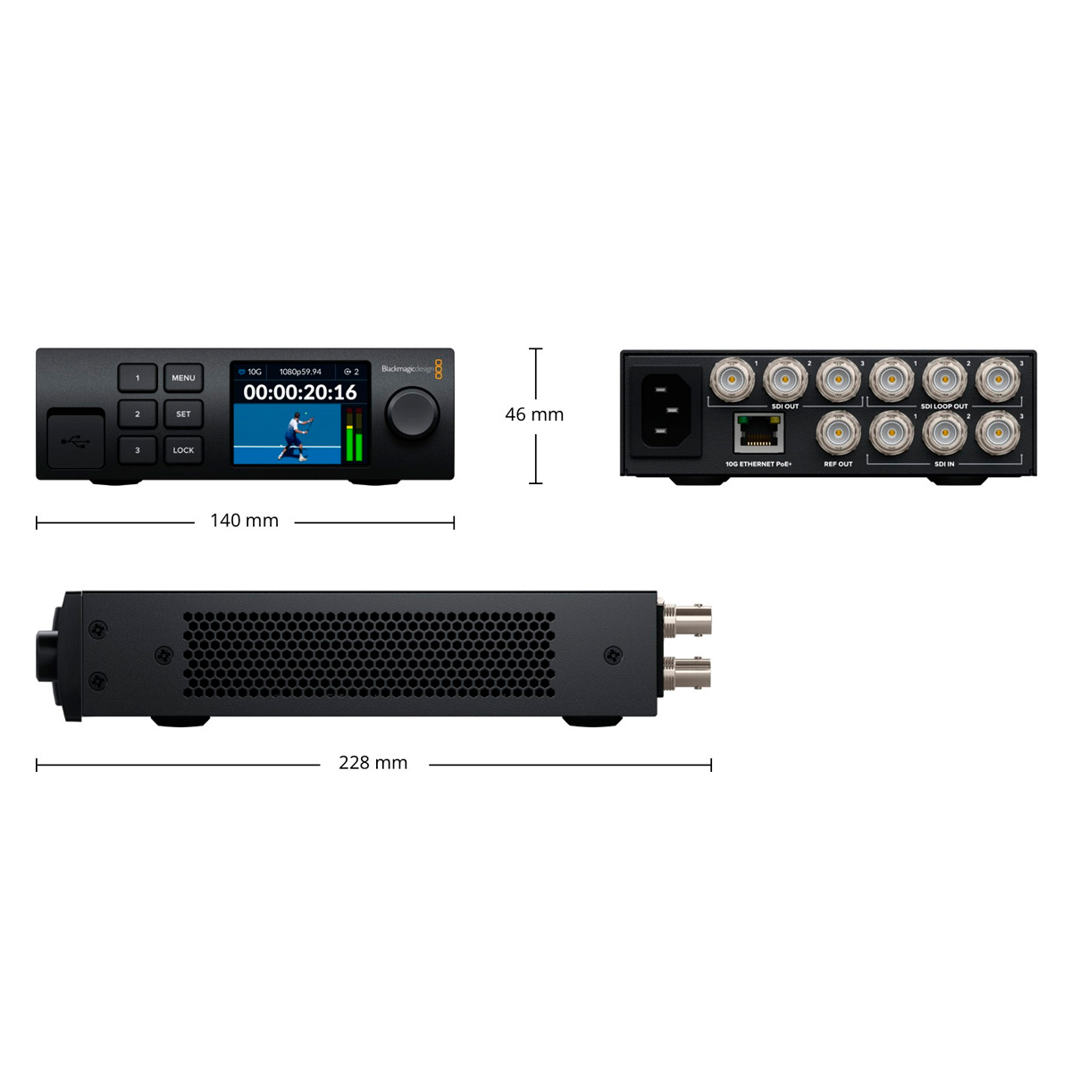 Este conversor ha sido diseñado para conectar equipos de difusión audiovisual SDI 12G a sistemas IP SMPTE-2110. Incluye cuatro canales de conversión bidireccionales con conexiones Ethernet 10G RJ-45 en un diseño de una unidad de bastidor. Además, permite alimentar otros dispositivos, por lo cual es posible conectar cuatro unidades Blackmagic Studio Camera 6K Pro simultáneamente. Cada canal cuenta con una entrada SDI 12G. A su vez, este modelo dispone de una salida SDI 12G para la señal de retorno