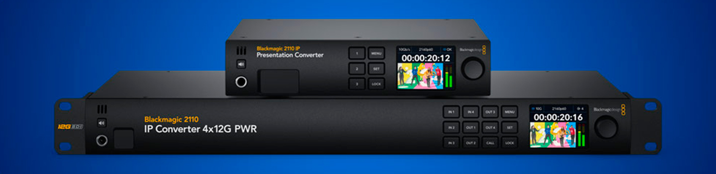 Blackmagic Design cuenta con una amplia gama de productos IP SMPTE-2110 que incluyen conversores, monitores audiovisuales y cámaras. Todos ellos admiten señales UHD a través de conexiones Ethernet 10G económicas. La mayoría de los conversores son bidireccionales, por lo cual son fantásticos cuando es necesario transmitir una señal de retorno adicional a la cámara. Por su parte, los modelos modulares presentan un diseño elegante con una pantalla LCD color para supervisar las imágenes, acceder a los menús y diagnosticar posibles errores. Los dispositivos de esta línea cumplen con los estándares SMPTE ST-2110, relativos a las transmisiones audiovisuales mediante el protocolo de Internet (IP). Además, son compatibles con relojes PTP y con las especificaciones NMOS, de manera que es posible realizar conexiones mediante matrices de conmutación. El modelo Blackmagic 2110 IP Converter 3x3G incluye una salida para señales de referencia sincronizada con el reloj PTP 2110.