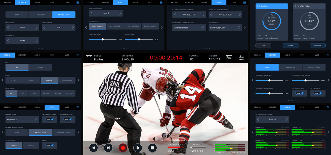 Este grabador y reproductor diseñado para escritorios incluye un mando de búsqueda de gran tamaño que permite encontrar rápidamente los clips. Según el modelo, brinda compatibilidad con archivos ProRes, DNx, H.264 y H.265 en formato NTSC, PAL, 720p, 1080p y 2160p, e incluso cuenta con una función de teleprónter. Existen distintas versiones con tecnología SDI 12G y HDMI que facilitan la conexión de cámaras y mezcladores. Además, es posible grabar en tarjetas SD y UHS-II o discos USB-C. El modelo HyperDeck Shuttle 4K Pro incluye conectividad Ethernet 10G y una memoria M.2 interna que ofrece la oportunidad de compartir el material grabado a través de una red local o almacenarlo en cualquier unidad conectada a esta.