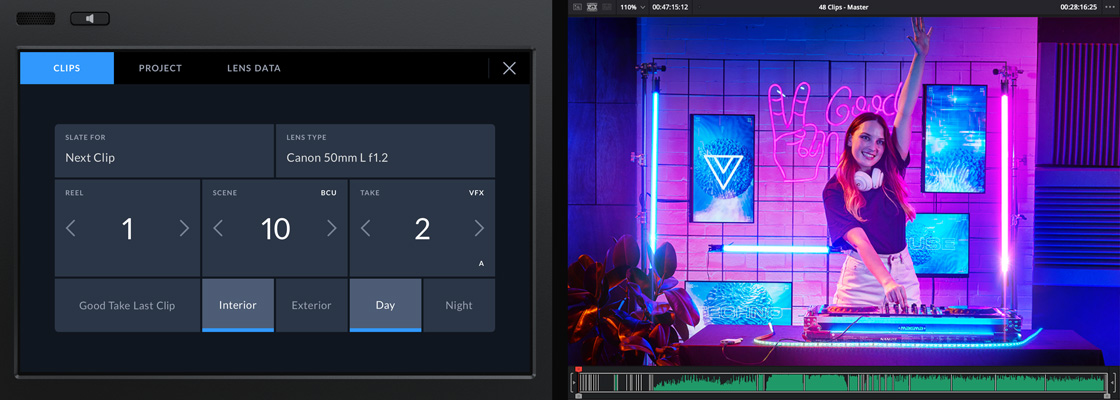 El modelo HyperDeck Shuttle 4K Pro incluye una claqueta virtual avanzada permite añadir metadatos a cualquier toma con facilidad. Para acceder a ella, basta con deslizar el dedo sobre la pantalla hacia la izquierda o la derecha. Al comenzar y detener la grabación, el número de toma se incrementa automáticamente, a fin de evitar tener que introducirlo de forma manual. A su vez, el número de rollo aumenta cada vez que se formatea una tarjeta. Los metadatos se almacenan en los archivos para poder acceder a ellos desde programas tales como DaVinci Resolve durante la posproducción. El modo de cinta de este programa organiza las tomas según los metadatos, facilitando así su selección.