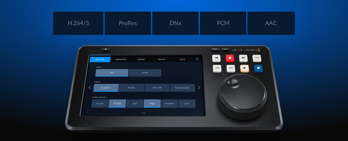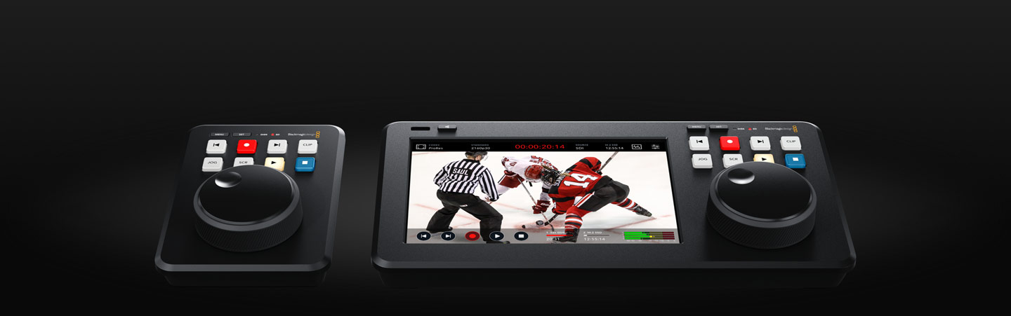 Grabador de escritorio con mando de búsqueda de gran tamaño que permite buscar y reproducir clips con facilidad. Ideal como reproductor multimedia para el modelo ATEM Mini. Compatible con archivos H.264, ProRes o DNxHD en tarjetas SD/UHS-II o discos USB.