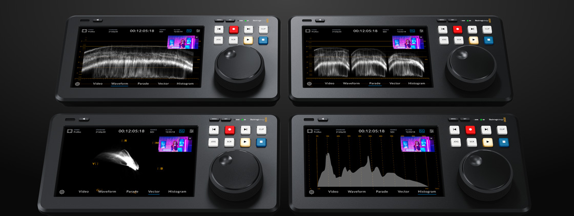 El modelo HyperDeck Shuttle 4K Pro ofrece herramientas de supervisión integradas para garantizar el cumplimiento con las normas de difusión en trabajos de alta gama. En tal sentido, el monitor de forma de onda permite ver el nivel de luminancia de la señal recibida o reproducida. Por su parte, el vectorscopio muestra la intensidad del color a un nivel de referencia SDI de 100 %. Las gráficas YUV y RGB son ideales para establecer niveles cromáticos adecuados, mientras que el histograma brinda información sobre la distribución de las luces y las sombras o la pérdida de detalles. Estos indicadores pueden superponerse a la imagen, la cual también se visualiza en una pequeña ventana en la parte superior derecha del indicador.